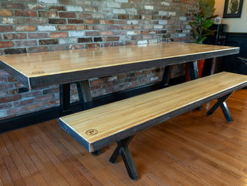 We make furniture out of authentic, reclaimed bowling alley lanes. Perfect for the ultimate bar top, striking dining room table (pun intended), conversation-starting coffee table, benches, TV console table, unique side tables or even kitchen carts. Or take it to the next level and make one of these tables customized with your favorite sports team, company logo, or family crest which will make the perfect addition to your home or business. The possibilities are endless for these refurbished and upcycled solid maple and/or pine bowling alley lanes to add a fun feel to your game room, office, dining room, kitchen, restaurant, or even boardroom!